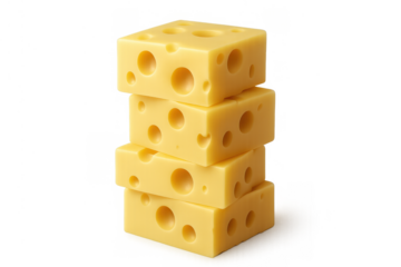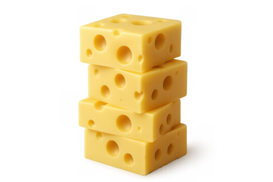 Stacked cheese cubes for snacks, dairy food product, yellow emmental portions on transparent background