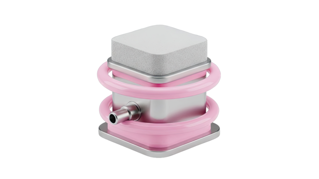A 3D render of a dark, cubic object with rough, textured surfaces. It has glowing green lights scattered across its form
