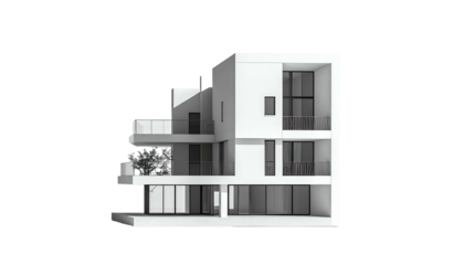 Modern, white multi-story building with balconies, large windows, minimalist design
