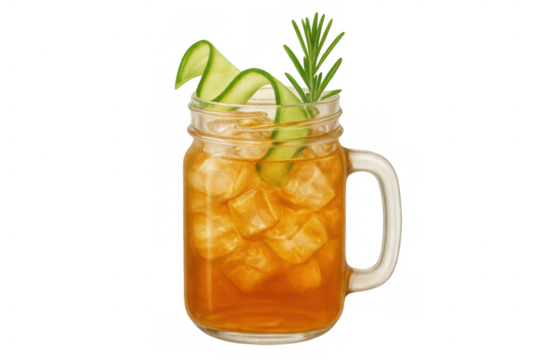A refreshing sparkling drink with cucumber slices and fresh rosemary sprigs, presented in a tall glass, transparent png isolated.