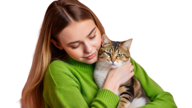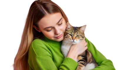 A serene portrait of a young woman cuddling with a cat, highlighting the peaceful and loving connection between them.