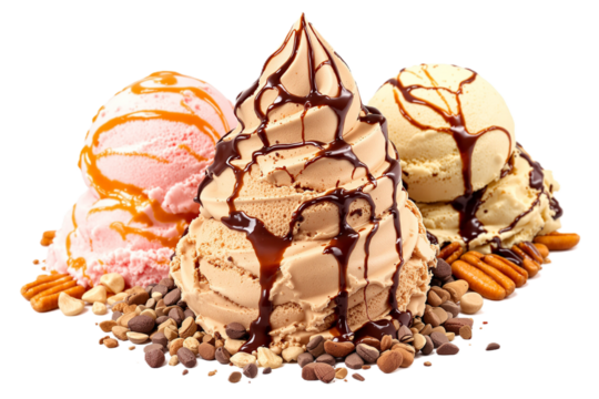 Set bundle of vibrant ice cream scoops with flavor cues transparent PNG isolated background. Caramel swirl, coffee, butter pecan flavors, tasty colorful summer presentation, flavour cue ingredients
