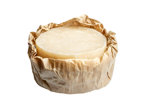 A round wheel of cheese wrapped in brown paper, showcasing its intriguing texture and natural appearance, perfect for culinary projects.