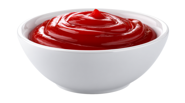 A white ceramic bowl filled with glistening red tomato ketchup, perfect for food photography, culinary presentations, or recipe content creation.
