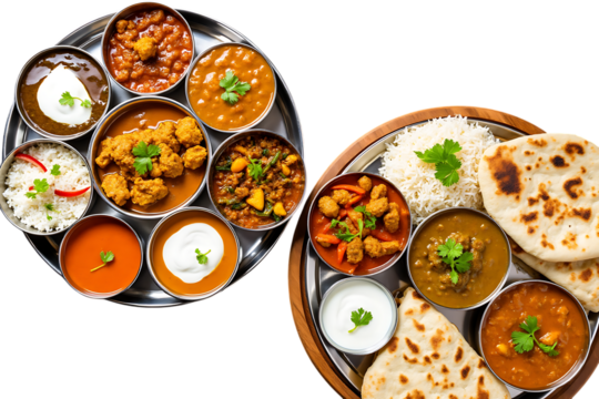indian thali meal a variety of curries, rice, and breads served together, isolated on transparent background