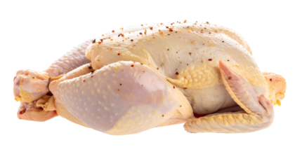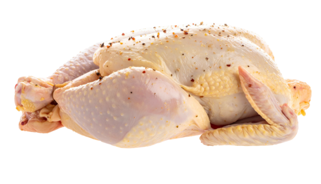 Raw whole poultry, seasoned and ready for cooking, sits on a transparent background
