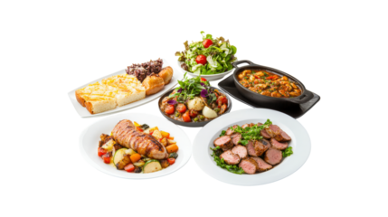 Assortment of various dishes with meats and vegetables isolated on transparent background
