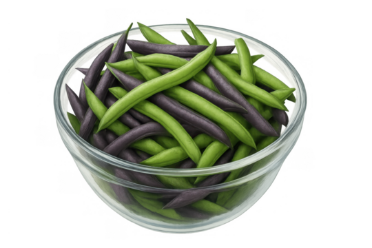 Fresh green and purple string beans in glass bowl, healthy raw vegetable ingredient, transparent background