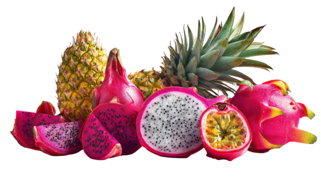 Exotic Fruits Photography: Vibrant exotic fruits like dragon fruit, passion fruit, and pineapples, isolated on a Transparent background, PNG file.