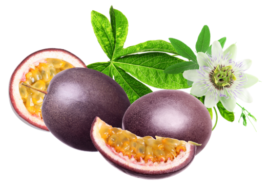 Juicy passion fruit half and whole fruit with green leaves isolated on transparent background