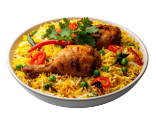 A vibrant culinary presentation of aromatic rice with roasted chicken, fresh herbs and vibrant chilies