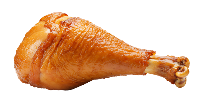 Cooked turkey leg with a dark brown shiny skin set against a stark black background Bone end visible