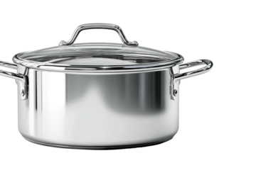 Modern stainless steel cooking pot with a transparent glass lid emitting gentle steam, ideal for showcasing culinary themes, food preparation, and kitchen appliance displays