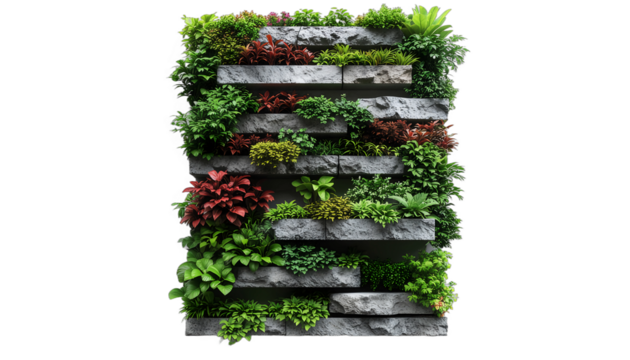 Vibrant Living Wall A Detailed Perspective of a Lush, Green Vertical Garden with Diverse Plants and Stones, Perfect for Eco-Friendly Designs