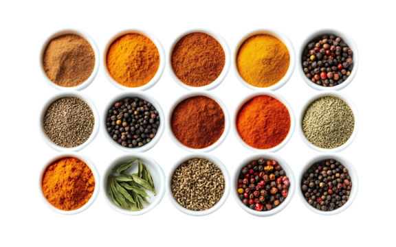 A white bowl filled with a variety of spices including pepper, cumin on islated transfarent background, PNG.