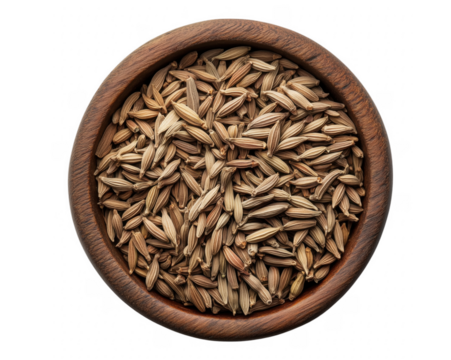 Overhead shot of cumin seeds in a wooden bowl on a transparent background for culinary purposes