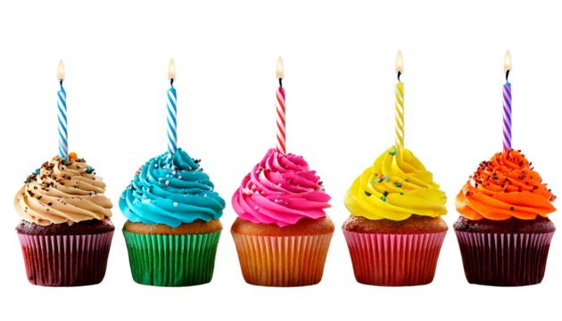 Multicolor happy birthday cupcakes isolated on transparent background