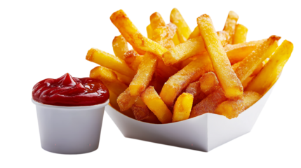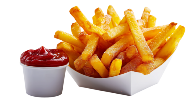 French fries served in a wooden tray with a small cup of ketchup, isolated on transparent background