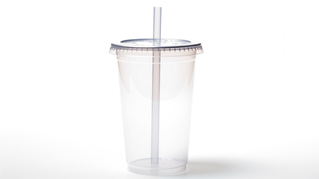 Transparent plastic cold drink cup with dome lid, empty and clear with smooth edges, commonly used for iced beverages or smoothies, isolated on transparent background