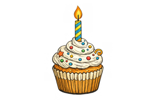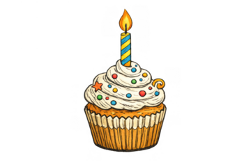 Birthday cupcake illustration with lit candle, frosting and colorful sprinkles, celebrating party and sweet dessert