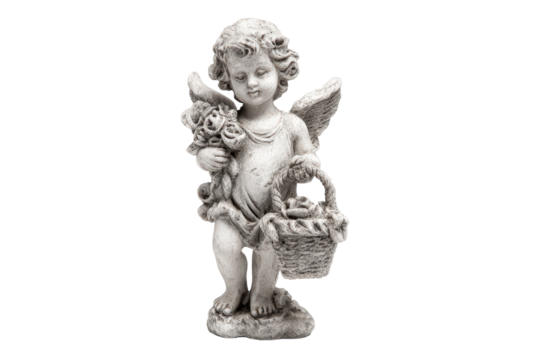 Elegant marble cupid statue with wings holding decorative arrow, isolated on a transparent background