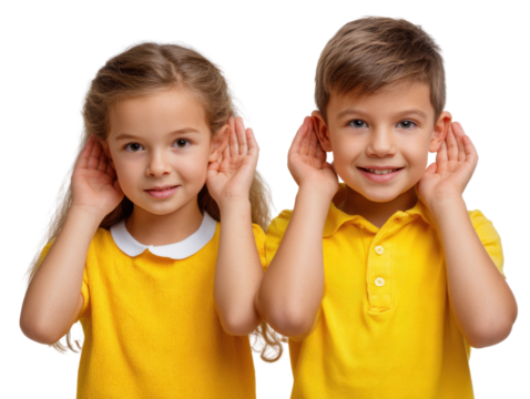 Attentive Children: Two young children with curious expression listening intently, hands cupped behind their ears, bathed in natural light.