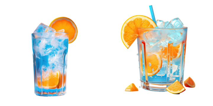 Bright blue cocktail featuring lemon garnish, sitting atop clear surface with glistening ice cubes, highlighting cool summer beverage
