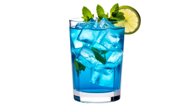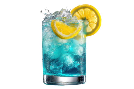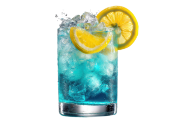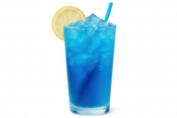 Blue Lagoon cocktail with lemon wheel garnish white PNG isolated background. Mixology, bar menu, colorful vibrant refreshing drink in highball glass