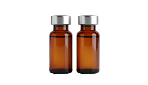 Close-up of a glass vial containing clear liquid, silver cap, dark background