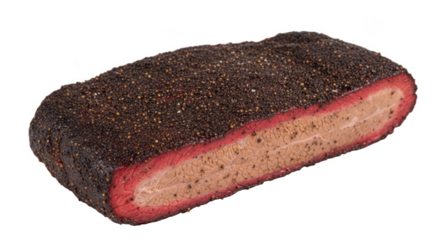 A cut piece of cured meat with a poppy seed crust on isolated transparent background