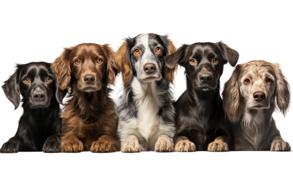 Group of Dogs Sitting Together. A group of dogs of various breeds and sizes sitting closely next to each other on the grassy ground showing a sense of unity and companionship.