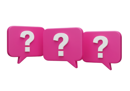 Isolated 3D chat bubbles feature white question marks, conveying uncertainty or curiosity