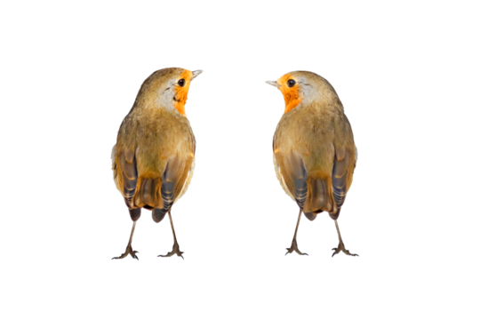 Isolated bird. Cute bird robin. White background. European Robin. Erithacus rubecula.