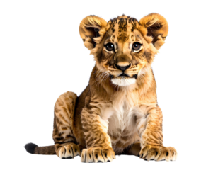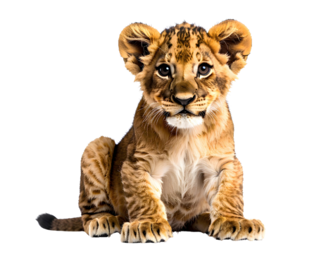 Adorable lion cub sitting, playful and curious young feline, isolated on transparent background, PNG