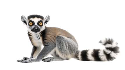 Curious and attentive ring-tailed lemur with soft, grey-brown fur and distinctive black and white striped tail, is seated in a relaxed pose, gazing forward with, isolated on transparent background.