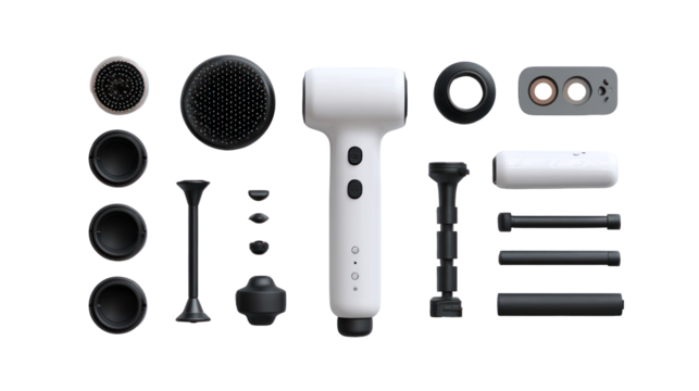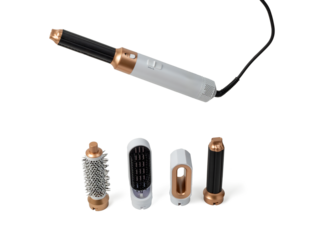 Electric hair curler with chrome barrel in a gray travel case on a transparent background