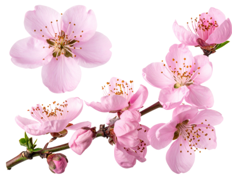 Set of Side angle view of a delicate pink blossom branch with petals softly curling