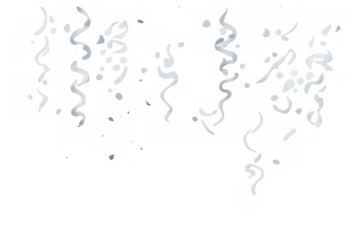 Silver falling confetti and curling ribbons creating festive celebration background design with transparent background