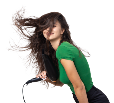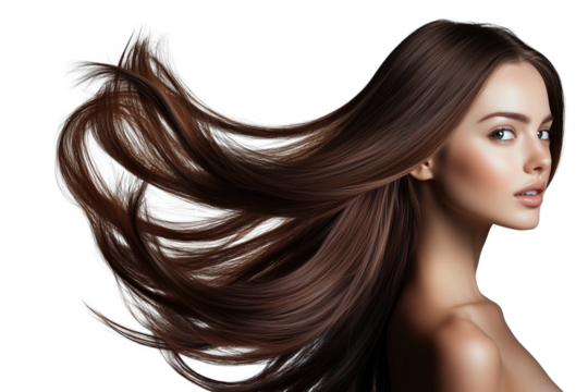 A beautiful woman with long brown flowing hair. Beauty and hair care concept. Isolated on a transparent or a white background, cut-out, PNG