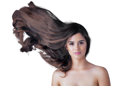 Hair, wind and woman in portrait isolated on transparent png background of salon, color treatment or hairdresser results. Healthy glow, hairstyle in air or growth with face of young person for beauty