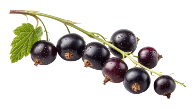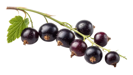 A small cluster of delicious fresh ripe black currant berries with green leaves on a transparent background