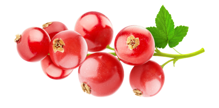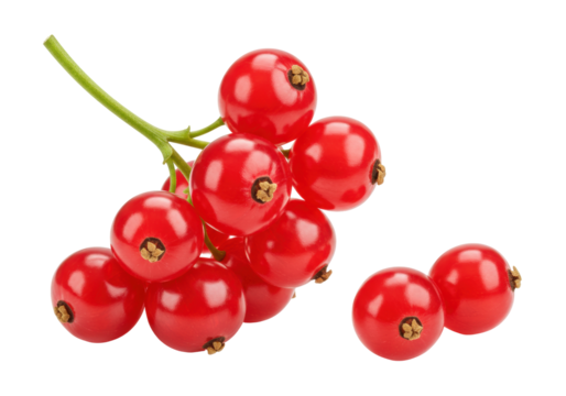 Isolated bunch of vibrant red currant berries with a sprig on a clean background.