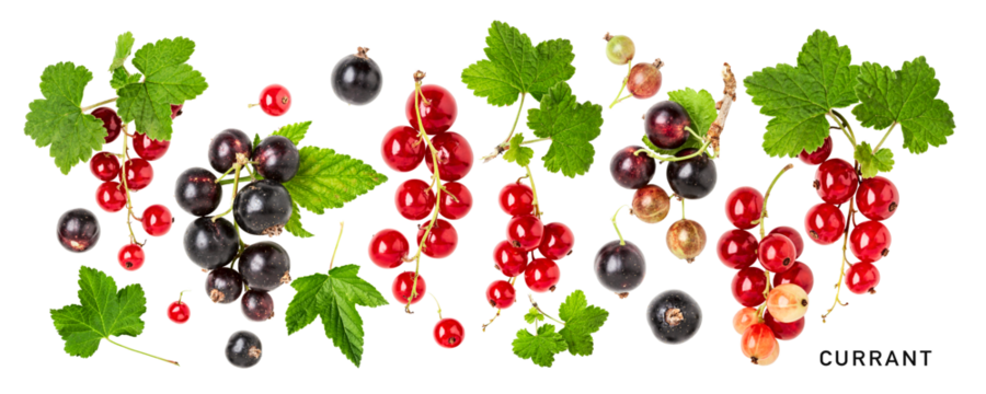Red black currant berries collection isolated. PNG with transparent background. Flat lay. Without shadow.