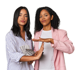 Hand holding mobile phone screen mockup and paper money, dollars isolated on white background. Finance application frame