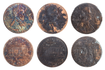 Isolated photo of old rusty worn and burned american 1 cent coins on white background.