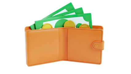 Orange wallet with cash and coins