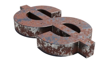 Rusty metal dollar sign PNG isolated on transparent background, weathered currency symbol for finance and industrial design