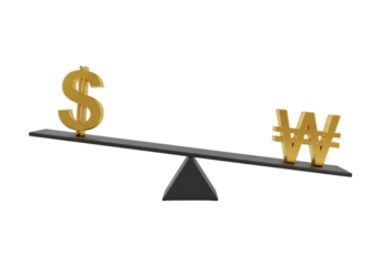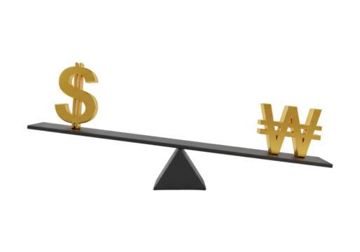 3D Illustration of Gold Dollar and Won Symbols Balanced on See-Saw