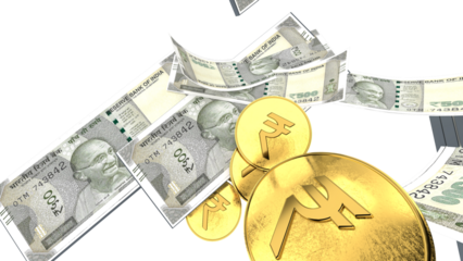 Golden Indian rupee sign and Indian currency coin isolated on 3d render. bearish and bullish golden arrow stock market background.