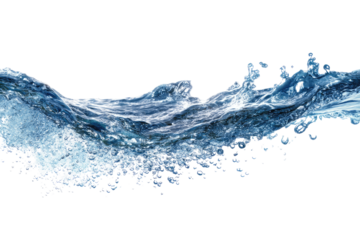 Water splashing upwards, creating a dynamic crown shape with droplets, demonstrating movement and purity. Transparent background